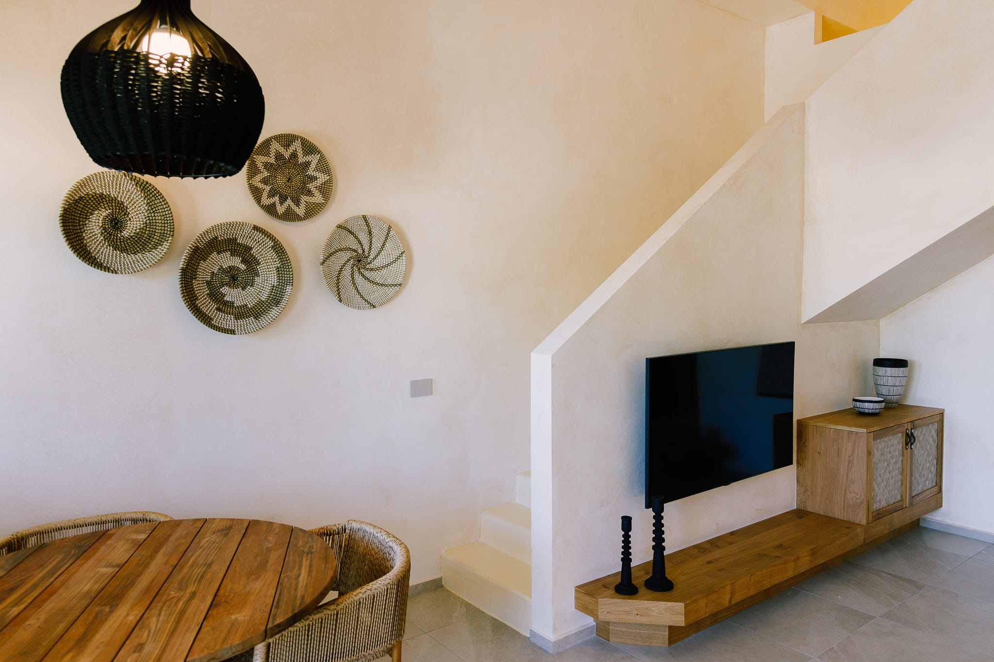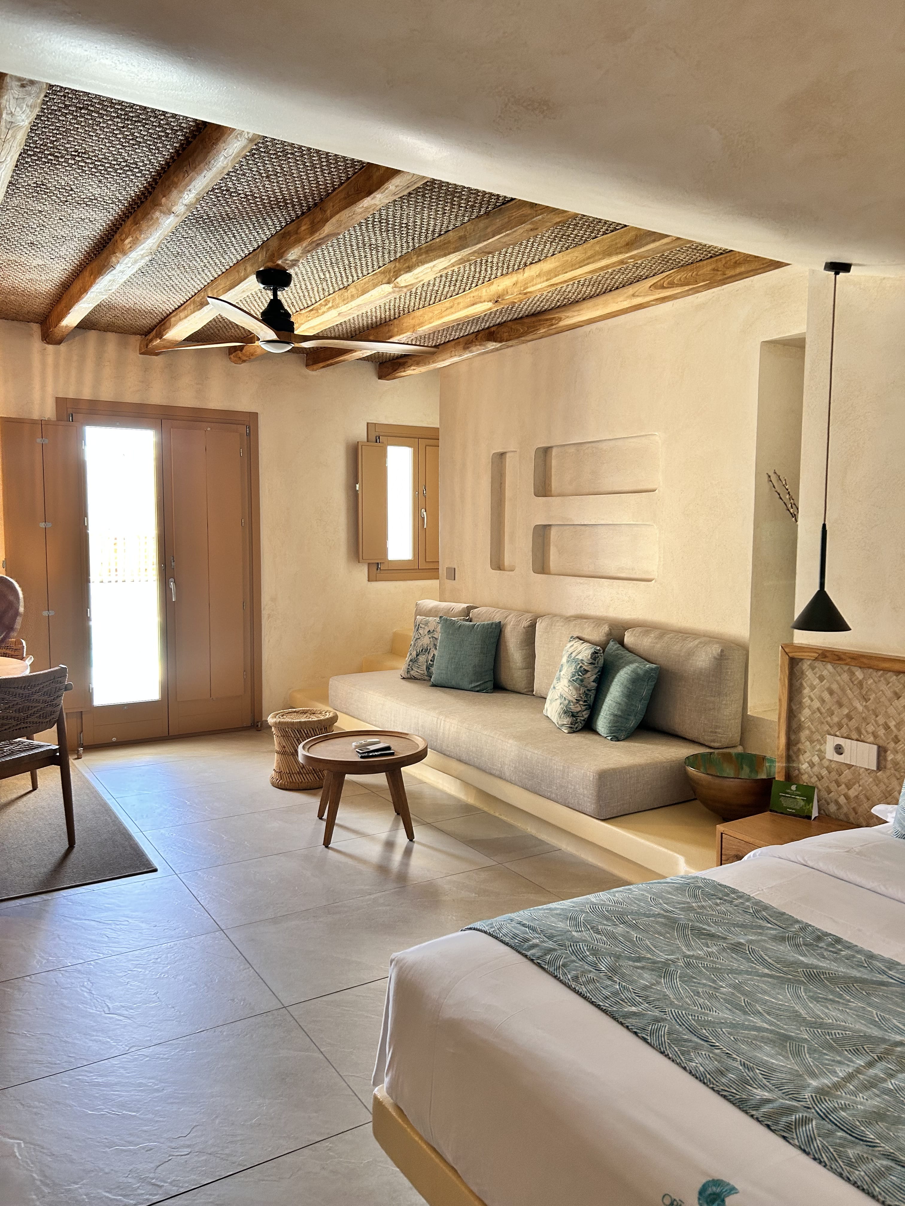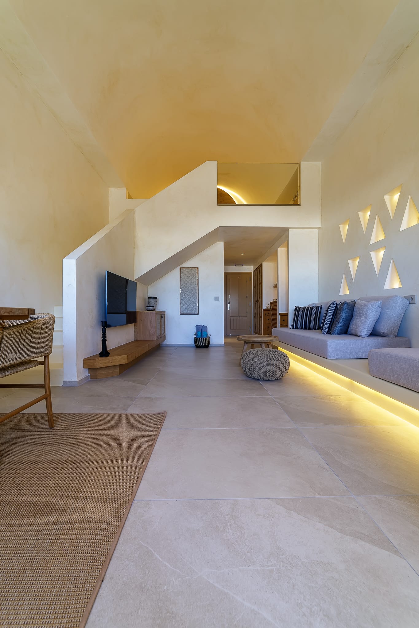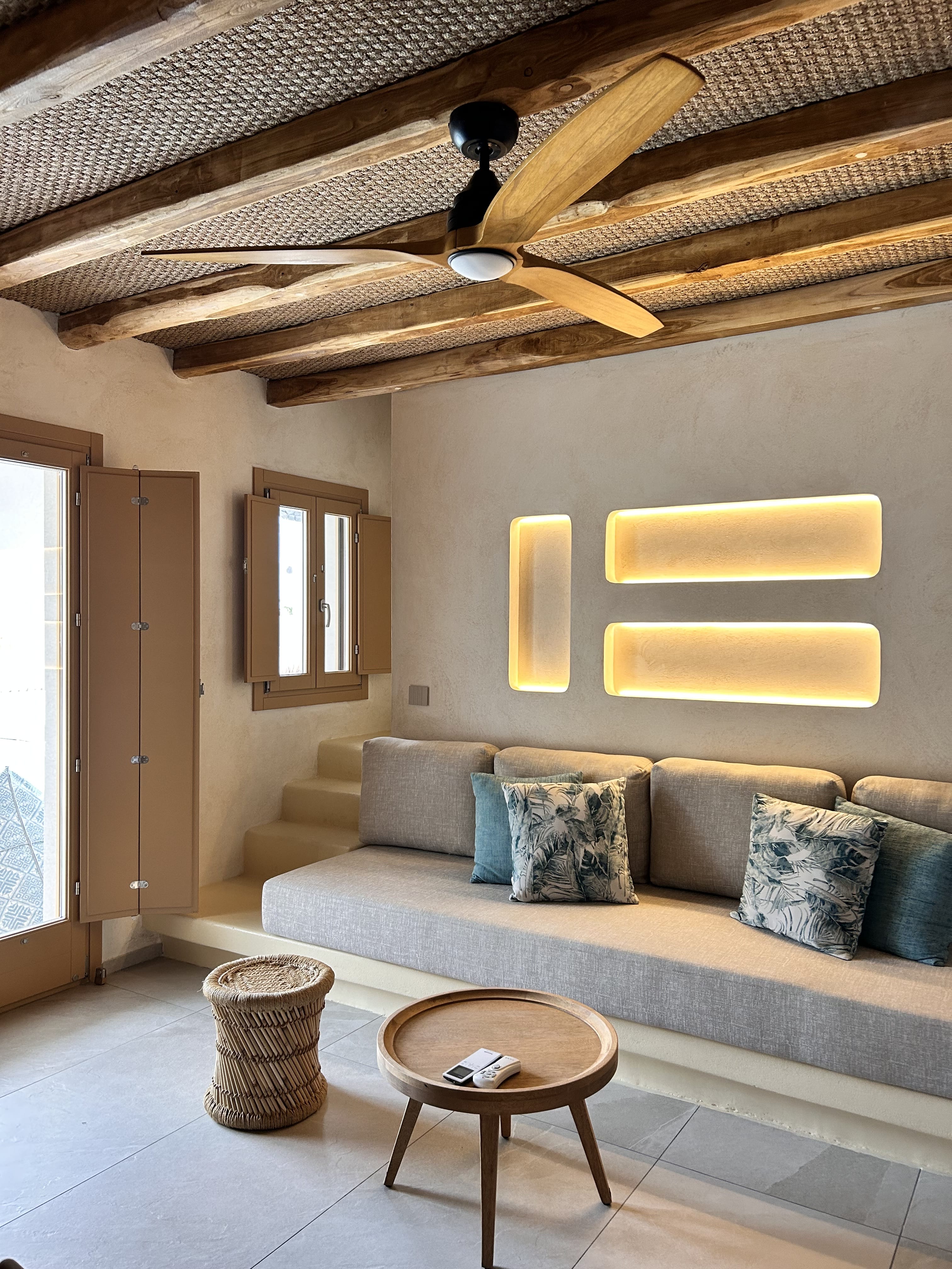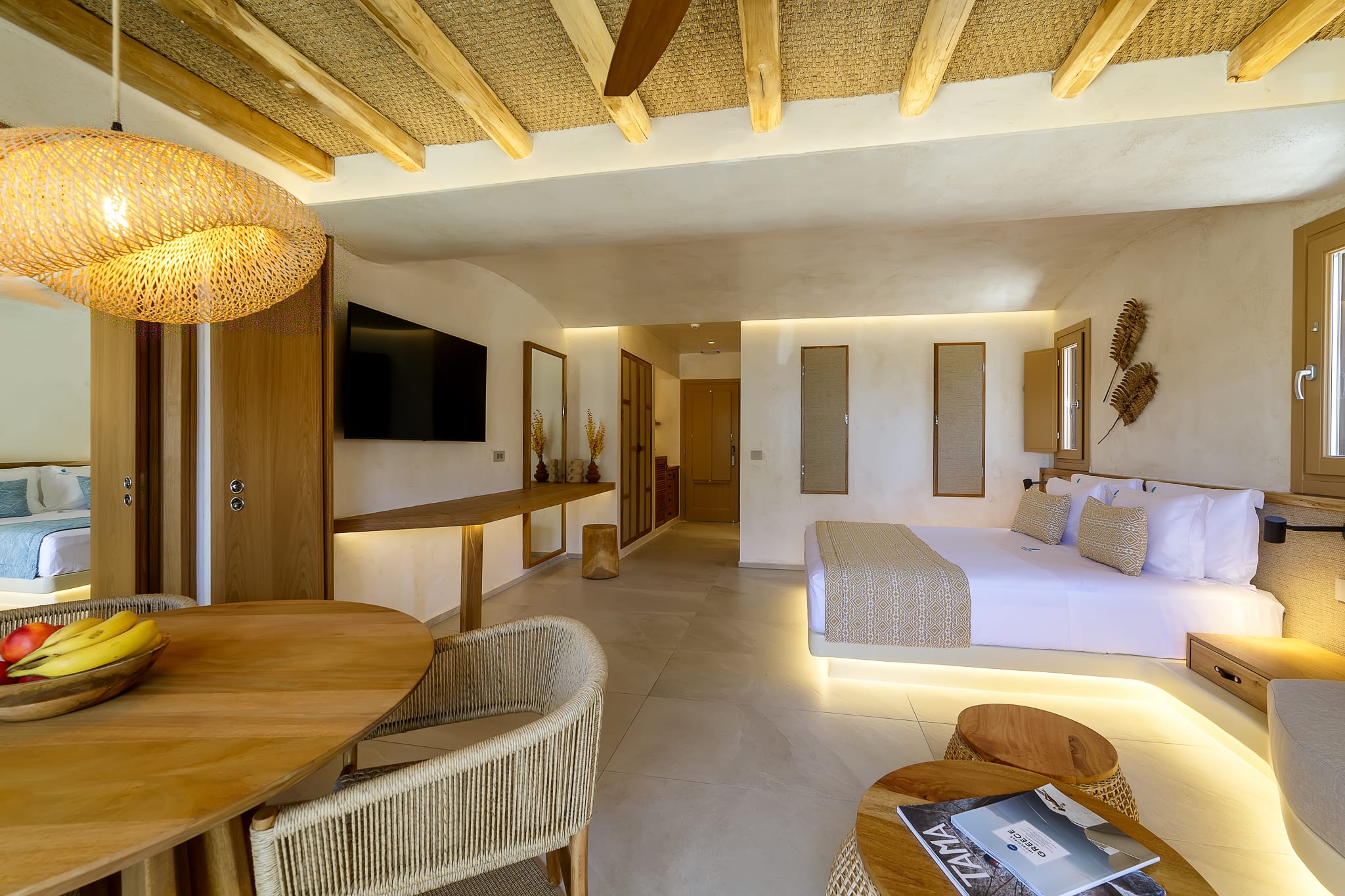 Opalia Suites represents an oasis of sophistication in which you will eagerly return in the evenings, after exploring the Mediterranean's most cosmopolitan island, for a refreshing cocktail under the glowing stars on your suite's private terrace or balcony before going inside to perhaps watch your favourite movie/tv series on the 55-inch flat-screen TV of your elegant living room with the built-in sofa. Your immensely comfortable bed, with the luxurious mattress and a large pillow selection, awaits you at the end of the day. Ensuring, combined with the sound-proofed windows, a heavenly sleep experience.